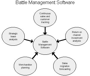 Battle management software illustrated above can provide continuous feedback and analysis to maximize channel value and allocate resources to maximize return. It should track the location of online shoppers and compare their zip code with the closest store to determine the extent of sales migration. The software would seek to discover opportunities from merchandising in each channel or combination of channels by use of financial metrics to uncover what works online versus what works in the store and/or the catalog. Another feature should be to aid leasing strategy based on sales migration patterns.